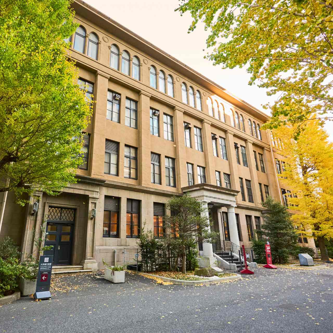 入口には、明治期に正門となっていた門柱を加工した一対の御影石円柱があり、大学の歴史を伝えている。