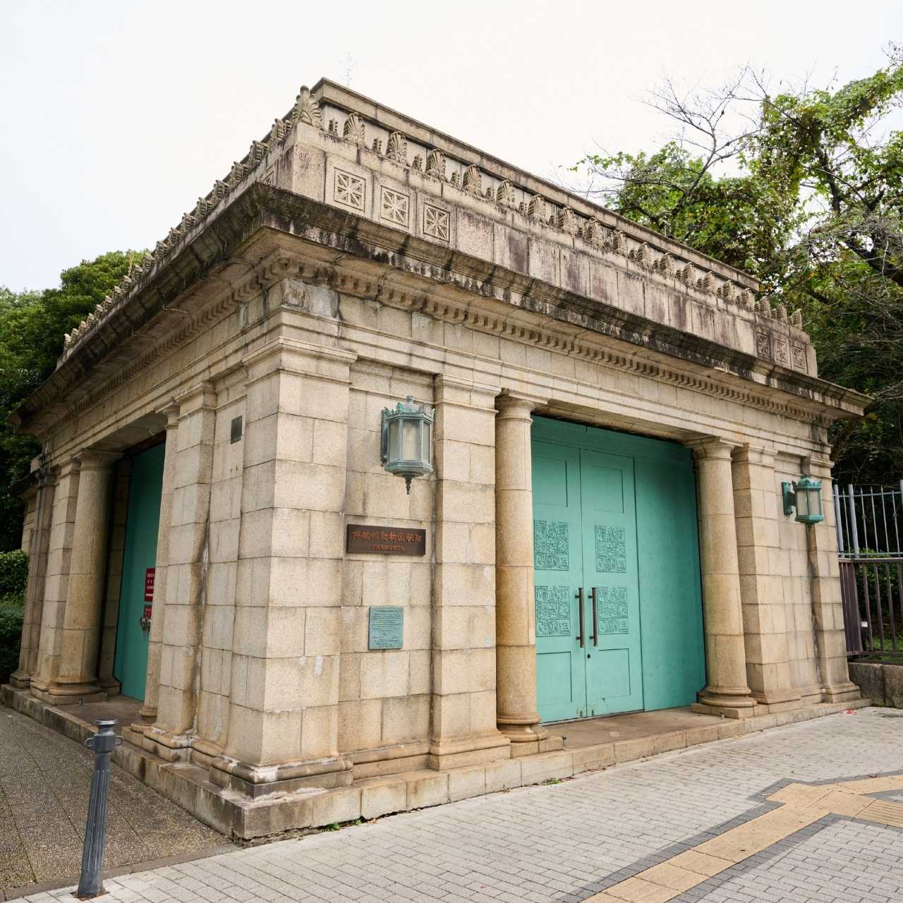- 京成電気軌道の地下駅として開業した旧博物館動物園駅(廃止)の駅舎。東京国立博物館・東京藝術大学・都立上野恩賜公園に囲まれた交差点の角地に面し、方形屋根で円柱の付いた出入口部分と陸屋根の階段部分を組み合わせた外観が良く確認できる。